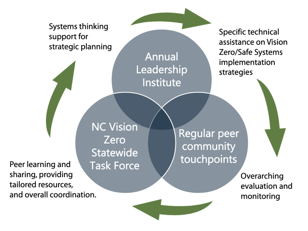 The NC Vision Zero Leadership Institute is a key component of the NC Vision Zero Collaborative Support Model.
